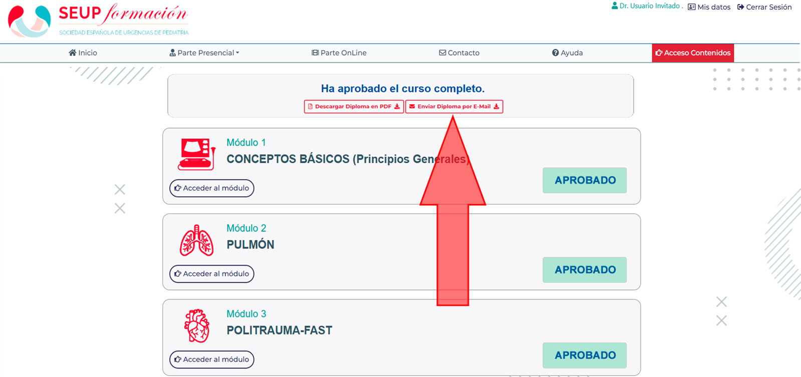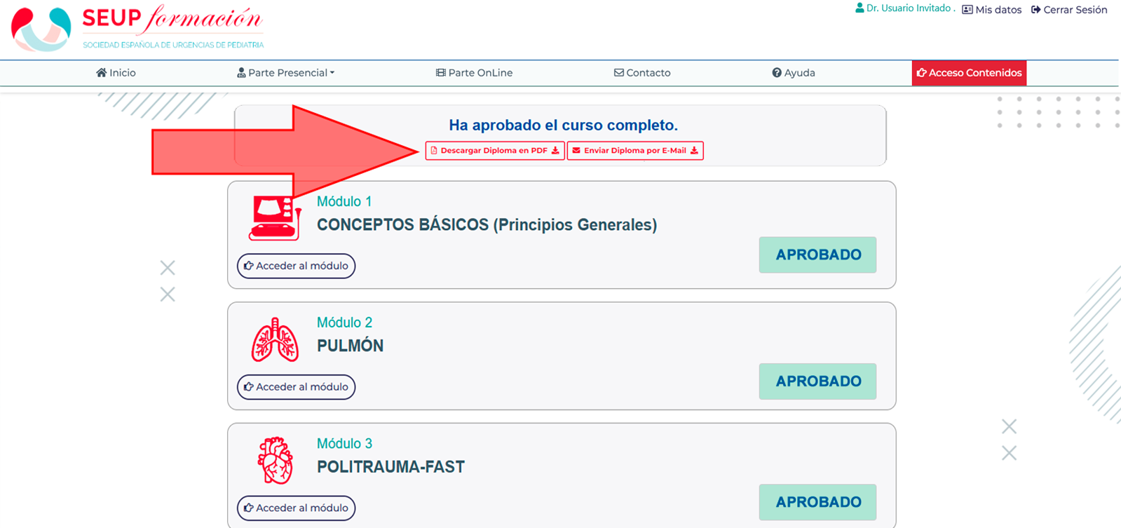 Para descargar el diploma que certifica que ha aprobado la parte online del curso puede hacerlo desde la página que da acceso a los contenidos y haciendo click en el botón "Descargar Diploma en Pdf".