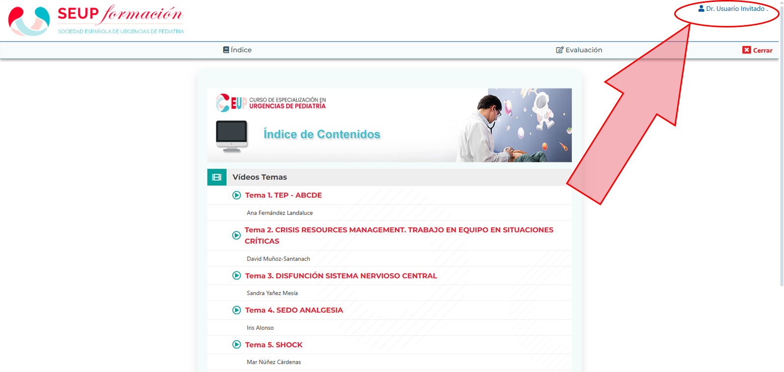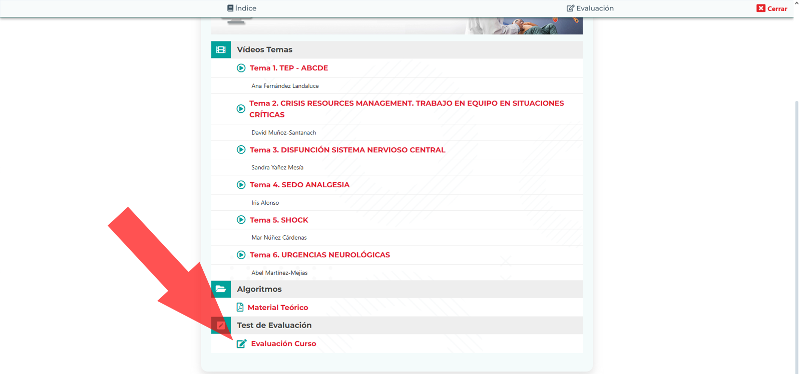 Por último, si quiere acceder a la Evaluación desde el índice del curso haga click en el botón que le indica la Figura 6. Recuerde que también puede hacerlo haciendo click en la opción "Evaluación" del menú de navegación.