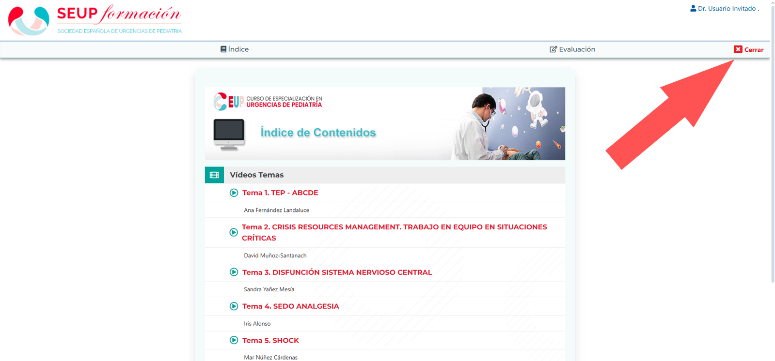 Para cerrar la página de los contenidos del curso y volver a la página del acceso inicial que se muestra al iniciar sesión sólo tiene que hacer click en la opción "Cerrar" situado en la esquina superior derecha del menú de navegación de contenidos del curso (Figura 4).